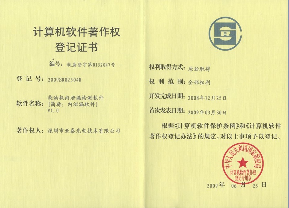 亞泰光電首頁  >>  走進亞泰  >>  亞泰光電資質榮譽  >>   軟件著作權  >>  柴油機內泄漏檢測軟件