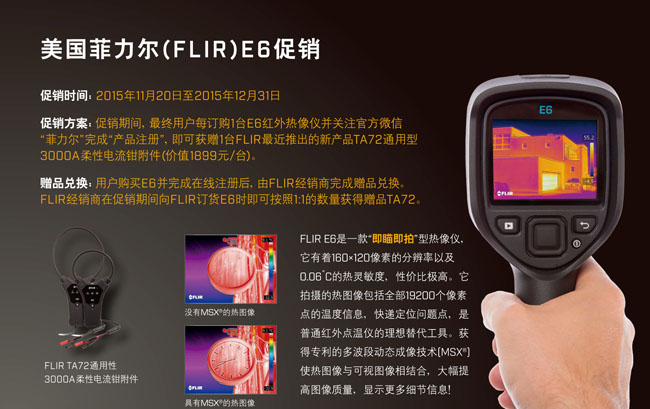 促銷方案:促銷期間,最終用戶每訂購1臺E6紅外熱像儀并關注官方微信“菲力爾”完成“產品注冊”,即可獲贈1臺FLIR最近推出的新產品TA72通用型3000A柔性電流鉗附件(價值1899元/臺)。