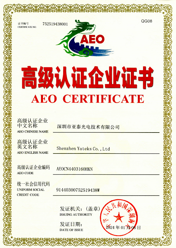 扎根中國,放眼全球。亞泰光電將以此次海關(guān)AEO高級認(rèn)證為契機,進(jìn)一步提高海關(guān)業(yè)務(wù)處理能力,持續(xù)提升企業(yè)經(jīng)營管理水平,大力拓展國際市場,不斷增強品牌知名度和核心競爭力,在國際市場舞臺上展現(xiàn)更大作為。