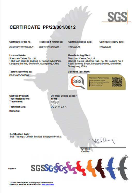 標定和量的索源是油液監(jiān)測的保證亞泰光電擁有完善標定儀器的油液實驗室,油液傳感器經(jīng)過獲得標準樣品、設(shè)置標準樣品、測量標準樣品、校準傳感器、驗證標定結(jié)果、記錄標定等步驟,最終獲得高準確度的油液傳感器。亞泰光電和SGS達成了深度戰(zhàn)略合作,金屬磨粒檢出率可達95%以上,獲得了SGS頒發(fā)的全球首張傳感器性能金標認證(Sensor Trust)。