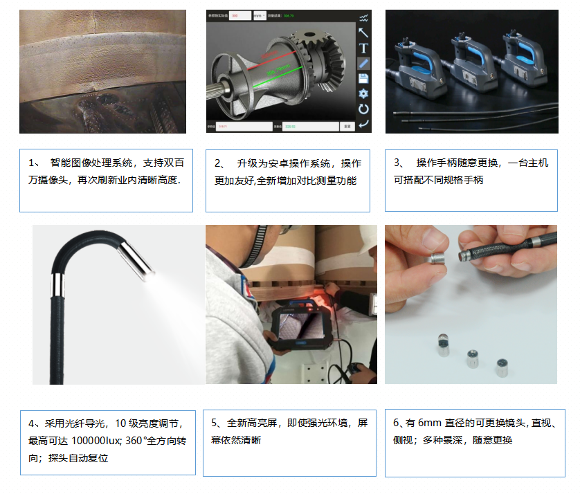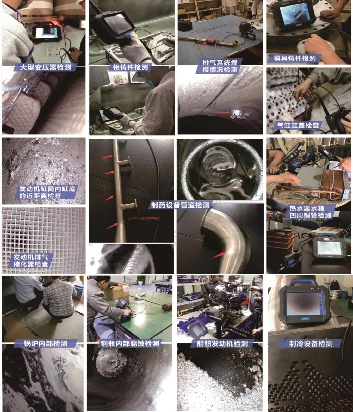 本儀器廣泛應(yīng)用于航空、汽車、船舶、電氣、化學(xué)、電力等現(xiàn)代核心工業(yè)生產(chǎn)、檢修等多個(gè)環(huán)節(jié)。具有直接可視的特點(diǎn),能夠直接觀測(cè)管道、渦輪、汽缸、發(fā)動(dòng)機(jī)等大型裝置內(nèi)表面是否存在缺陷或異狀。可進(jìn)行實(shí)時(shí)拍照和視頻錄制,為分析設(shè)備使用狀況及設(shè)備生產(chǎn)保障提供不可或缺的數(shù)據(jù)采集。